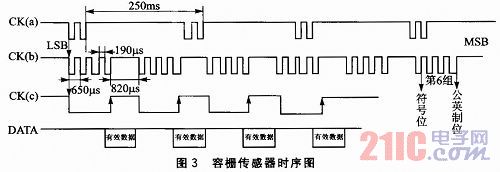 容柵傳感器時序圖如圖3所示。其中包含3個CK信號說明和1個DATA信號說明。CK(a)表示要發送的完整數據間的時序關系;CK(b)表示一個完整數據內部各個數據組的時序關系;CK(c)和DATA表示一個數據組內的時序關系和對采樣點的說明。由圖可知數據每隔250 ms發送一次,在時鐘CK的上升沿數據有效。數據由LSB到MSB依次發送,總共24位二進制數據,分成6組,每組數據間隔820μs。其中前5組為數據位,第6組為控制位組(包含符號位和公英制位),控制位組的第0位的“0”表示正數,“1”表示負數,第3位“0”表示公制單位mm,最小單位0.01 mm,“1”表示英制單位inch,最小單位0.000 5 inch,x表示無效。為了能夠實時采集數據,采用中斷方式檢測CK信號,邊沿觸發。檢測CK信號的高電平持續超過820μs時,當出現下降沿時觸發中斷,進入中斷程序,再持續檢測低電平直到出現上升沿,讀取DATA信號電平并存儲,總共采集24位。返回主函數根據符號位和公英制位進行相應處理。相關程序代碼如下: