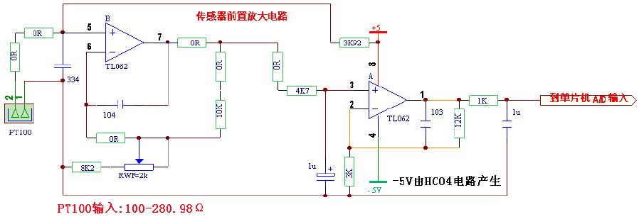 單片機的 10 位 A/D 在滿度量程下,最大顯示為 1023 字,為了得到 PT100 傳感器輸出電壓在顯示 500 字時的單片機 A/D 轉換輸入電壓,必須對傳感器的原始輸出電壓進行放大,計算公式為:(500/1023 * Vcc)/傳感器兩端電壓( mV/℃ ) ,(Vcc=系統供電=5V),可以得到放大倍數為 10.466 。