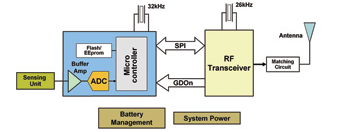 每個無線傳感器都被看作一個節點,擁有無線通信能力,同時還具有一定的信號處理與網絡數據的智能。根據應用的類型,每個節點都可以有一個指定的地址。圖2顯示了某個節點的通用結構圖。它一般會包括一個傳感裝置、一個數據處理微控制器,以及一個無線連接RF模塊。根據不同的網絡定義,RF模塊可以起到一個簡單發射器或者收發器 (TX/RX)的作用。進行節點設計時,注意電流消耗和處理能力非常的重要。微控制器的內存非常依賴于所使用的軟件棧。