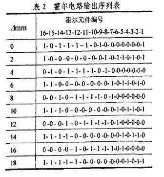 霍爾電路的工作原理是,在外磁場的作用下,當磁感應強度B超過導通工作點時,霍爾電路輸出管導通,輸出低電-半:若曰值低于釋放點時,輸出管截止,輸出高電半。因此在“凸槽”時鋼質活塞桿被磁化,磁感應強度曰增加,霍爾電路導通,輸出低電平,用“1”表示;在“凹槽”時輸出高電平,用“0”表示。以第1個霍爾元件為測量基準,從圖2所示時刻起,位移暈旃次變化b=2mm時,一個碼區行程內霍爾電路輸出的二進制序列如表2所示。分析可知,序列的標識碼為l 0000000 1,其前面或后面6位序列數分別為相鄰的兩個數值碼,這使它具有很強的容錯能力。標識碼每隔一個霍爾元件間距N在低位部分右移一位。值得注意的是,標識碼前面的數值碼代表磁性標尺當前檢測位置下一個碼區的值。