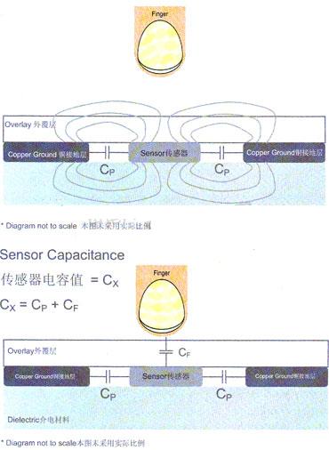 那么,電容式感應的工作原埋是什么呢?下面的示意圖顯示了1個電容式感應按鈕的橫截面。如圖所示,在外覆層材料之下,存在導電的銅塊區域和導電的傳感器。在2個導電元件相互之間靠得很近時,就會產生一個電容值,本圖中標為Cp,這個電容值是由于傳感器墊板與接地板之間的耦合現象而形成的。Cp屬于寄生電容,典型數量級任10pF至300pF。傳感器與接地板靠近時也會形成一個邊緣電場,這個電場能夠穿透外覆層。基本上,人體組織也屬于導電體。將一根手指放存邊緣電場附近時,就會增加這個電容系統的導電表面面積。
