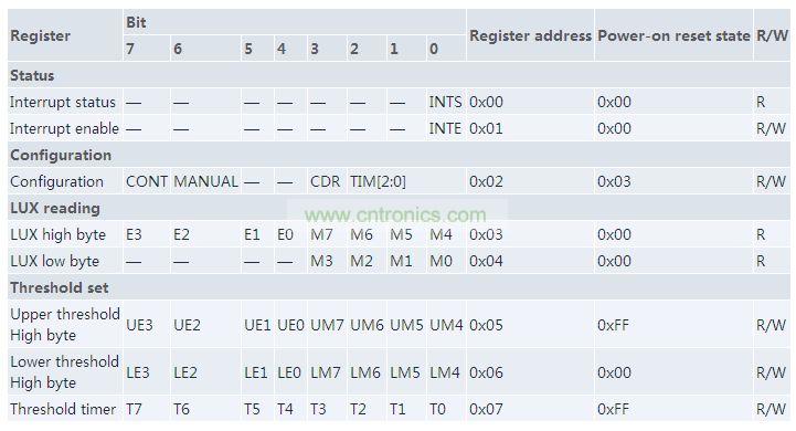 當光積分時間為100ms的倍數(如:100/200/400/800ms)時,這些環境光傳感器能夠很好地抑制50Hz/60Hz噪聲干擾。然而,多數情況下,很多應用需要一個轉換完成信號,在可靠讀取環境光傳感器信息時避免不必要的延遲。本應用筆記主要介紹如何使用器件的中斷引腳提供轉換完成指示,詳細說明I²C寄存器的設置方法。