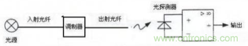 調(diào)制器是敏感元件,置于入射光纖和接收光纖之間,在被測(cè)對(duì)象的作用下,使敏感元件的光路遮斷或使敏感元件的光穿透率發(fā)生變化,這樣,光探測(cè)器所接收的光量便成為被測(cè)對(duì)象調(diào)制后的信號(hào),經(jīng)放大、解凋后,就可得到被測(cè)對(duì)象。