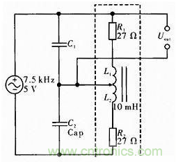 如圖1如果沒有C1和C2為普通半橋電路,虛線框中為電感傳感器的等效電路,傳感器測頭的位移帶動螺線管中鐵芯上下移動,從而改變上下兩個線圈的電感值。將兩線圈等效成純電阻和純電感的串聯,如圖中R1和L1組成上線圈,R2和L2組成下線圈,輸出接在上線圈上。實際傳感器中線圈與輸出的接線不會變,只是通過鐵芯移動來改變電感,所以R1和R2固定不變。