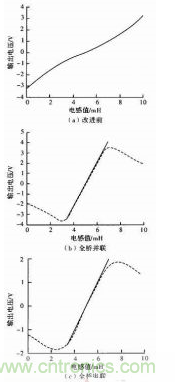 普通全橋在3.8~6.3 mH段,電壓變化范圍為-1.2~+1.3 V,電壓對電感的靈敏度為1 V/mH。線性度近似為1.38。對圖4(b)和圖4(c)使用Matlab進行最小擬合直線如圖所示,在3.8~6.3 mH段,并聯方式輸出電壓的變化范圍為-2.66~+2.66V,靈敏度為2.130V/mH線性度可達1.68%。串聯方式的輸出電壓范圍約為-1.25~+1.25V,靈敏度約為2.130V/mH線性度可達1.33%。