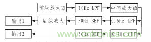 放大濾波電路是根據(jù)人體的呼吸率范圍(15~20次/min)和心率范圍(50~100次/min),經(jīng)相關(guān)檢測電路的信號分為兩路,分別檢測呼吸和心跳 信號,具體結(jié)構(gòu)框圖如圖4所示。其中放大電路主要包括前置放大電路、中間級放大電路和后級放大電路3部分。濾波電路主要有低通濾波、高通濾波和帶阻濾波。 其分別組成0.6 Hz的低通濾波器(CPF)、0.7 Hz的高通濾波器(HPE)及50 Hz的陷波器(BEF)。