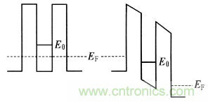 介觀壓阻效應(yīng)的定義為“等效電阻的應(yīng)力調(diào)制”,等效電阻是對共振隧效應(yīng)的一種具體描述。由4個物理過程組成:①在力學(xué)信號下,納米結(jié)構(gòu)中的應(yīng)力分布將發(fā)生變化;②一定條件下應(yīng)力變化可引起內(nèi)建電場的產(chǎn)生;③內(nèi)建電場將導(dǎo)致納米帶結(jié)構(gòu)中量子能級發(fā)生變化;④量子能級變化會引起共振隧穿電流變化。簡言之,在共振隧穿附近,通過上述過程,可將一個微弱的力學(xué)信號轉(zhuǎn)化。為一個較強的電學(xué)信號,體現(xiàn)出較大的壓阻系數(shù)。這里所用的介觀壓阻效應(yīng)元件為GaAs/A1As/InGaAs DBRT結(jié)構(gòu)薄膜納米級窄帶隙材料。隨著外部壓力引起的拉伸應(yīng)變的變化(如圖1所示),DBRT結(jié)構(gòu)的共振隧穿電流和阻抗顯著變化。并且,阻抗應(yīng)變輸出可由外部電壓有效調(diào)節(jié)。其優(yōu)點是靈敏度高、靈敏度可調(diào)、靈敏度隨溫度變化小。