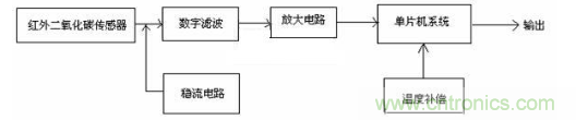 檢測電路由紅外二氧化碳傳感器、數(shù)字濾波電路、放大電路、穩(wěn)流電路、單片機系統(tǒng)、溫度補償?shù)冉M成。基本原理是紅外二氧化碳傳感器將檢測到的二氧化碳氣體濃度轉(zhuǎn)換成相應(yīng)的電信號,輸出的電信號分別經(jīng)過濾波、放大處理,輸入到單片機系統(tǒng),并經(jīng)溫度和氣壓補償?shù)忍幚砗螅蓡纹瑱C系統(tǒng)輸出送顯示裝置顯示其測量值。