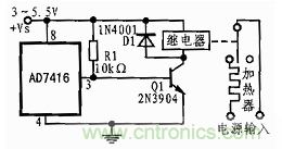 這些默認值可使該溫度傳感器在不連接串行總線時用作自動調溫器,圖4所示就是AD7416作為自動調溫器的典型應用電路原理圖。當被測量的環境溫度低于 THYST時,OTI輸出高電平,Q1導通,繼電器吸合,加熱器開始工作;當被測量的環境溫度高于TOTI時,OTI輸出低電平,將Q1的基極電位拉低以使其截止,繼電器釋放,加熱器停止工作。