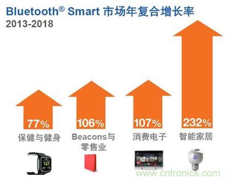 根據市場調研機構IHS的最新報告顯示,未來三年智能家居市場將呈現56%的年復合增長率,且至2018年市場上的產品出貨量將高達1.9億臺,而Bluetooth Smart 將成為近三年內智能家居領域成長最快速的無線連接技術。Strategy Analytics的數據也顯示,屆時將有2.24億個家庭,即全球12%的家庭,會安裝至少一種類型的智能家居系統。