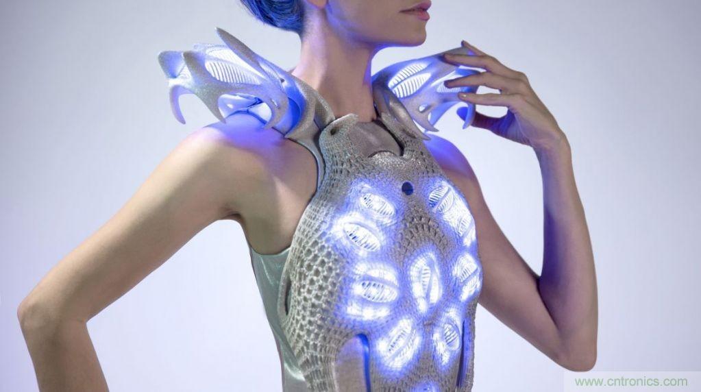 我們還可以通過肢體方面的一些表達來進行溝通,很顯然,要想充分利用人類的肢體語言,智能服飾是一個非常不錯的選擇。來自荷蘭的設計師Anouk Wipprecht就設計了一系列能夠通過生物特征識別技術來表達自身情緒的智能服裝。未來,我們可能會穿上一些帶有LED燈的類似盔甲之類的服裝,即使不說話也能表達自己的想法,不過我想應該會有人不喜歡這么奇怪的衣服。