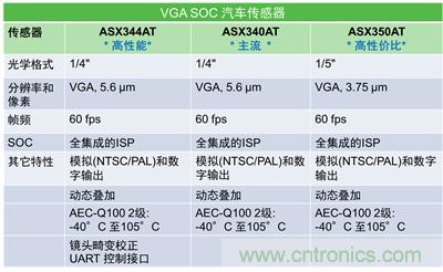 ASX344/340/350AT是用于倒車影像的系統級芯片(SoC),在單芯片上集成圖像信號處理器,增強的像素性能提供微光條件下的更高能見度,支持高達4層的圖像疊加以向顯示系統提供更多的倒車信息,支持數字縮放和平移,并附加光學中心點矯正功能,這可為客戶提供相機組裝生產后鏡頭中心點矯正功能,從而節省成本。這三款圖像傳感器都完全通過AEC-Q100認證,并具備-40°C至105°C的寬工作溫度范圍,它們的不同之處在于:ASX344AT還集成魚眼畸變校正功能和提供UART控制接口,定位為“高性能”的方案;ASX350AT的光學格式為1/5英寸,不同于ASX344/340AT的1/4英寸,定位為“高性價比”的方案;而ASX340AT定位為“主流”方案。設計人員可根據目標客戶的具體需求選擇有針對性的方案。