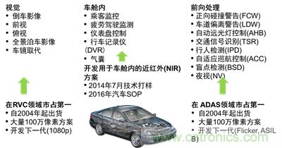汽車圖像傳感器的應用非常廣泛,包括用于視覺應用如倒車影像、前視、后視、俯視、全景泊車影像、車鏡取代,用于車艙內如乘客監控、疲勞駕駛監測、儀表盤控制、行車記錄儀(DVR)、氣囊,用于先進駕駛輔助系統(ADAS)如正向碰撞警告、車道偏離警告、自動遠光燈控制、交通信號識別、行人檢測、自適應巡航控制、盲點檢測、夜視等等。