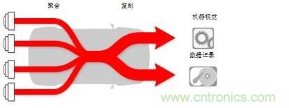 前置機器視覺攝像頭更是需要多個副本,但它將很快適用于自主車輛的附加攝像頭、雷達和光線檢測/測距(LIDAR)傳感器。數據記錄是一個當今非常常見的復制應用(圖1)。在機器視覺應用中,通常記錄某些行車狀況的原始傳感器數據,以用于未來分析。這種情況下,擁有聚合原始傳感器數據的第二副本,并將其用于數據記錄,是大有裨益的;而另一個副本則用于機器視覺處理。
