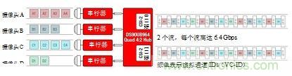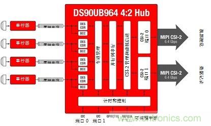 圖3所示為四攝像頭系統,具有由彩色塊所示的不同數據速率。聚合數據在移動工業處理器接口(MIPI)攝像頭串行接口(CSI)-2端口0和1兩者處呈現。CSI-2總線具有“突發性”,意味著其以固定數據速率運行、將發送數據為可用狀態,并且當機器空閑時恢復到低功率(LP)狀態。因此,傳感器速度可在不改變ECU處理器時序的條件下進行變化。即使傳感器鏈路以獨立頻率運行,解串器集線器在單個參考時鐘上也可將數據提供給片上系統(SoC)處理器,從而簡化系統時序。