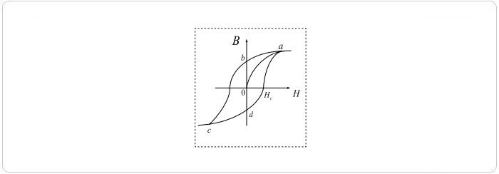 一般磁性材料都有S形狀曲線的特性,稱之為磁滯回路(hysteresis loop),如圖2所示。此磁滯回路曲線建立在B—H的坐標軸上,為磁性材料遭受完全磁化與非磁化周期,圖示為典型磁滯曲線的鐵心,如果曲線由a點開始,此點表示最大正磁化力,至b點磁化力為零,然后下降至c點為最大負磁化力,再至d點磁化力為零,最后返回最大正磁化力的a點,此即為整個磁性周期。高導磁率、低矯頑力磁芯的磁滯回線如圖3所示。