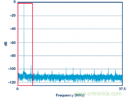 有多種方法可以減少落入紅框內的噪聲量。其中一種是選擇具有更好SNR(噪聲更低)的ADC?;蛘咭部梢允褂孟嗤琒NR的ADC并提供更快的時鐘(比如150 MHz),從而讓噪聲分布在更寬的帶寬內,使紅框內的噪聲更少。