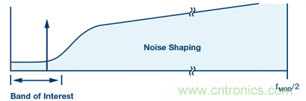 Σ-Δ型調制器通過對反饋回路(量化器輸出)調制,進而實現對量化噪聲整形,,從而降低目標頻段內的噪聲,但代價是增加帶外噪聲,如圖3所示。
