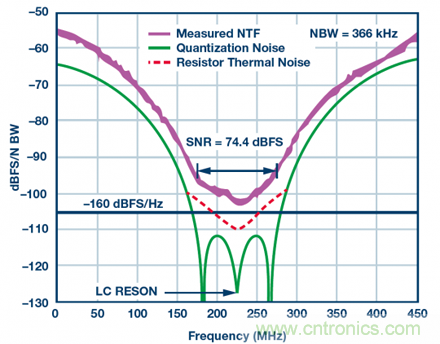 即使不進行完整分析,也可以看到,對于Σ-Δ型調制器,使用NSD作為確定帶內可用動態范圍的規格尤為有效。圖4顯示的是高速帶通Σ-Δ型ADC放大后的噪底曲線。在75 MHz目標頻段內(中心頻率為225 MHz),噪聲為-160 dBFS/Hz左右,SNR超過74 dBFS。