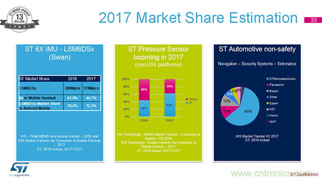 ST擁有較全的MEMS產品線,廣泛應用于消費、汽車、工業三大市場,能為客戶提供最廣泛的MEMS傳感器組合。值得一提的是,ST在消費電子市場主要供應6軸傳感器,占據了44%的市場份額;其中一款明星產品氣壓傳感器在手機、無人機等高檢測產品上廣受歡迎。2017年,ST在氣壓傳感器市場上占據了62%份額,主要分布在汽車非安全應用上,如中控方面。