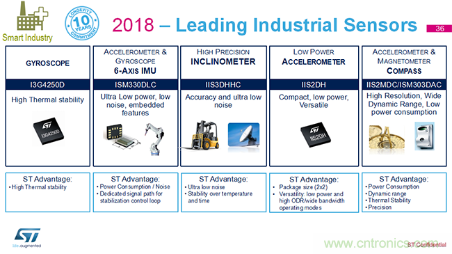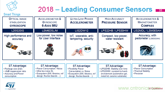 隨著IOT、AI等新興技術的高速發展,越來越多智能設備對產品測試準確度提出了更高的要求。ST將會針對物聯網應用進一步優化功耗管理設計。“下圖1為2018年ST主推的明星產品,從左到右包括圖像防抖陀螺儀、6軸IMU、超低功耗的加速度器件、起壓機,以及電子磁羅盤產品。”ST AMG高級市場工程師董愷指出。