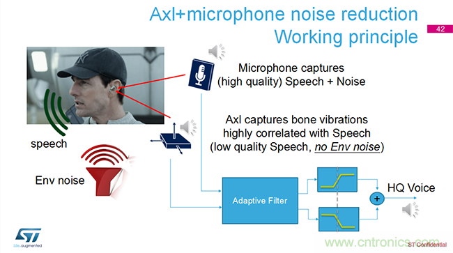 而LSM6DSR則是ST針對AI、VR應用而推廣的高精度傳感器。另外一款新產品LSM6DST也將于今年推出,主要在功耗方面有所提升,面向耳機應用。董愷補充道,“目前市面上的耳機都是雙麥設計,ST則對麥克風作了特別的設計:在用戶單獨使用耳機時,骨振動傳感器只采集聲帶的振動信息,再融合通過空氣傳播的聲音信息,對比分析出環境噪音并采取降噪措施,從而獲得高質量的上行語音信號。這也是ST今年將重點推廣的器件。”