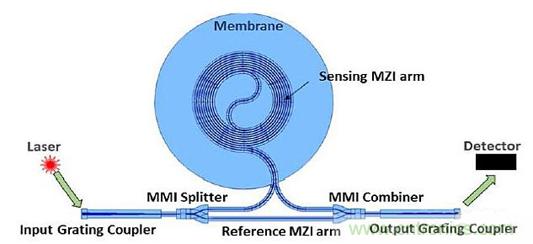 在功能上,從MZI發(fā)出的光強(qiáng)取決于兩個(gè)臂之間的相位差及其所承受的差壓。由于其中一個(gè)臂比另一個(gè)長得多,MZI是“不平衡的”。