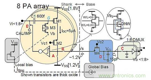 PA的面積受到電極大小的限制。其功率受限于可接受的組織加熱限制。噪聲需要比最小信號(hào)幅度(可能低至幾十微伏)更低。通常,降低噪聲的簡(jiǎn)單方法是為PA晶體管提供更多電流,這也將帶來更高帶寬。