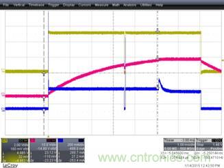 圖7所示是充電波形(綠線代表Vin;紅線代表Vload;藍(lán)線代表Iload)。