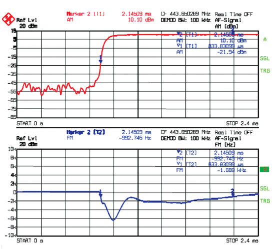 對于發(fā)射機(jī)和頻綜源來說,它們的幅度、頻率和相位瞬態(tài)特性是重要的測試指標(biāo)。一般來說,頻率穩(wěn)定時間是指發(fā)射機(jī)在輸出電平達(dá)到一定數(shù)值(通常為穩(wěn)定輸出功率-30dB)開始,監(jiān)測FM解調(diào)頻譜,直到頻率穩(wěn)定到設(shè)計限值之內(nèi)的這一段時間。